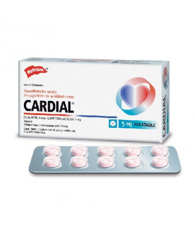 VTO 12/25Vasodilatador mixto y protector cardíaco en comprimidos de administración oral.Insuficiencia cardíaca en perros debido a insuficiencia valvular o cardiomiopatía dilatada.Fórmula:Cada comprimido contiene:Enalapril base (como maleato) 5 mg.Espironolactona 5 mg.Excipientes c.s.https://holliday-scott.com/ar/producto/cardiologicos/cardial