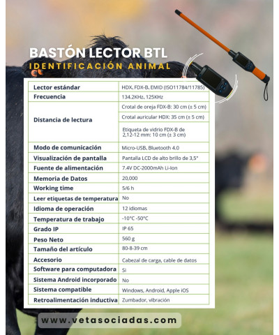 Bastón lector BTL para identificación animal. Este dispositivo utiliza tecnología RFID (identificación por radiofrecuencia) para leer caravanas o aretes electrónicos en el ganado