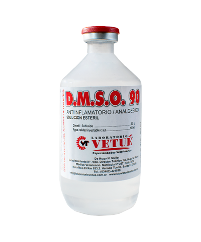 Antiinflamatorio y analgésico de aplicación local en contusiones, edemas, miositis, bursitis, esguinces, artritis y heridas. Facilita la absorción de otros fármacos de uso externo y puede maximizar el efecto de los fármacos administrados sistemáticamente.Componente:Dimetilsulfóxido 90 gr.Agua estéril qs 100 ml.https://laboratoriovetue.com.ar/en/product.asp?idver=3&aver=0&cver=2