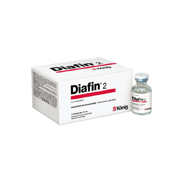 Antidiarréico modulador de la motilidad intestinal, inyectable.Cada 100 mL contiene: Clorhidrato de Bencetimida 0,0165 gramos (equivalente a 0,015 gramos de Bencetimida base); excipientes y vehículo c.s.https://www.koniglab.com/producto/diafin-2-2/